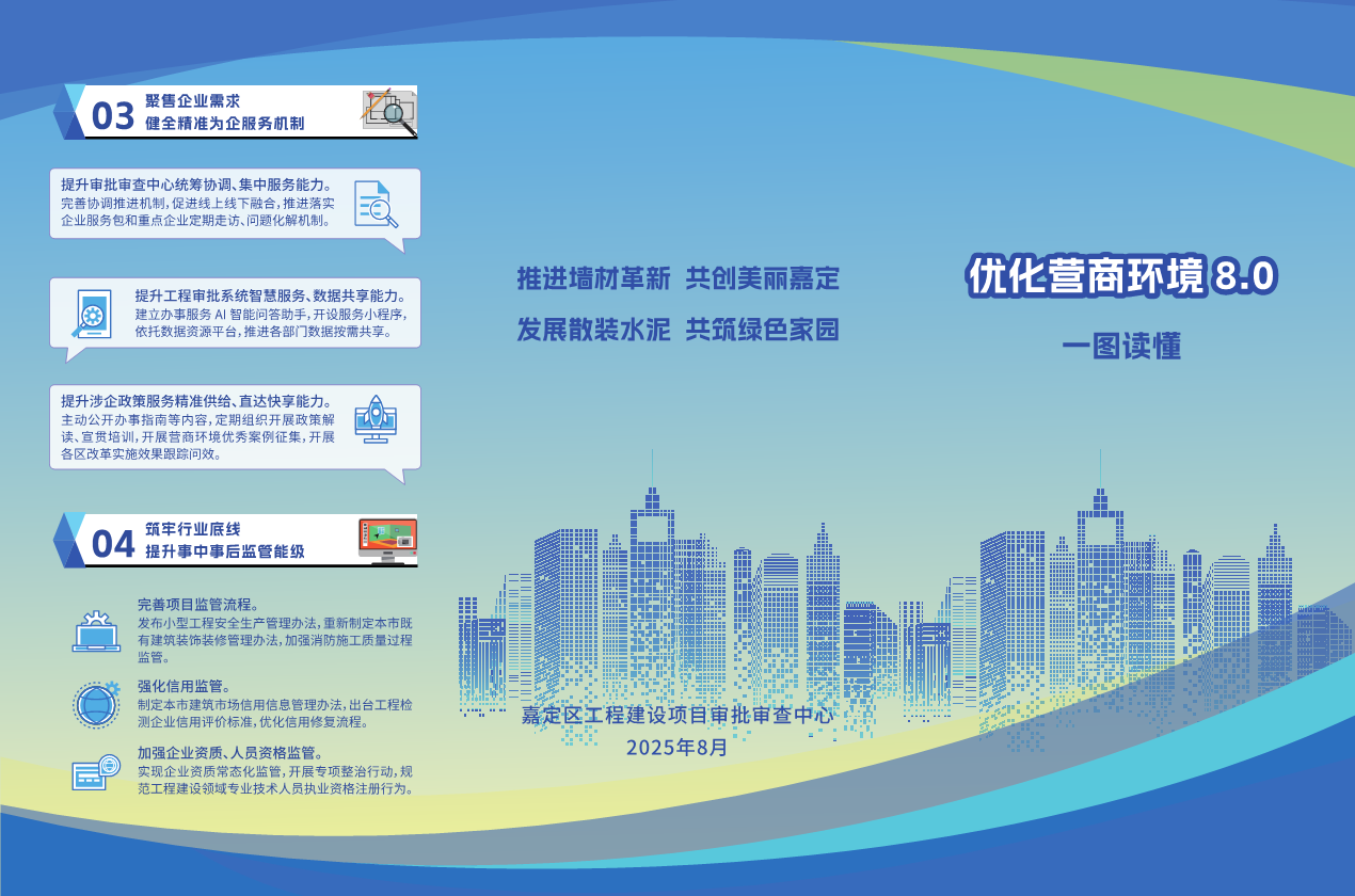 索引号: 发布机构: 区建管委 发文日期: 2025年08月20日 主题分类: 政策解读 关键词: 【一图读懂】优化营商环境8.0 发布时间:2025-08-20 浏览次数: 次 【字体:小 大】 原文:上海市嘉定区人民政府办公室关于印发《嘉定区聚焦提升企业感受持续打造国际一流营商环境行动方案》的通知解读会:聚焦营商环境8.0 紧扣企业需求 嘉定区审批审查中心举办2025年工程建设领域优化营商环境宣贯大会暨政府开放月活动